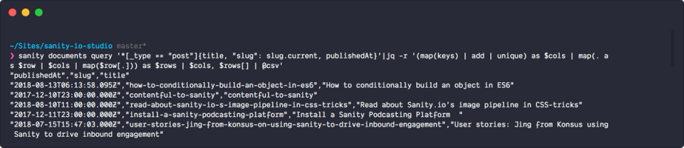 sanity documents query '*[_type == "post"]{title, "slug": slug.current, publishedAt}'|jq -r '(map(keys) | add | unique) as $cols | map(. as $row | $cols | map($row[.])) as $rows | $cols, $rows[] | @csv'You can copy this and run with it or play with it on jqplay.com, but let’s see what’s going on in the jq-expression: