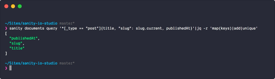 So if you wanted your documents of the type post, you could put $ sanity documents query '*[_type == "post"]'. Or if you just wanted those with a publish date in 2018 it would be $ sanity documents query '*[_type == "post" && publishedAt > "2018-01-01"]'. This query gives you whole documents, but if you just wanted the titles, and publish dates, you’d write: *[_type == "post"]{title, publishedAt}.